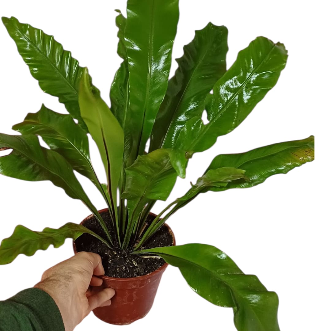 Riego: Es crucial mantener el sustrato uniformemente húmedo, pero nunca encharcado. Riega cuando la capa superior de la tierra se sienta un poco seca al tacto. El exceso de agua es el principal enemigo de este helecho y puede provocar la pudrición de las raíces. Es importante regar en el sustrato y evitar mojar el centro de la roseta o el "nido", ya que el agua estancada en ese punto puede causar la pudrición de la corona.