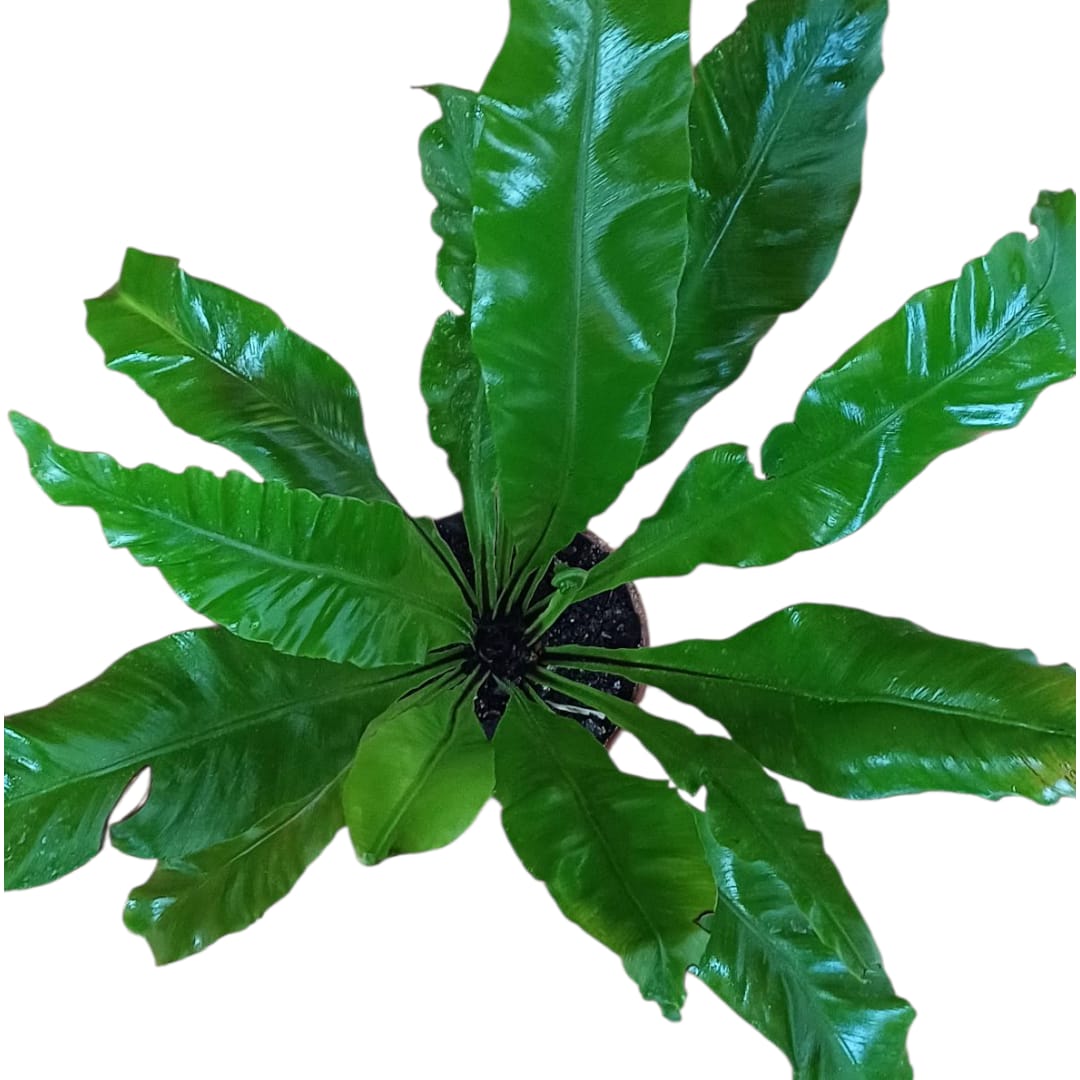Las hojas, o frondas, son largas, lanceoladas y de un color verde manzana o brillante que se despliegan desde un centro denso y peludo, que es el "nido". A medida que las hojas más jóvenes crecen, se enrollan suavemente y luego se abren, creando un espectáculo visual fascinante. La textura de las hojas es lisa y un poco ondulada en los bordes, lo que añade otra capa de interés. Este helecho es un epífito en su hábitat natural, lo que significa que crece sobre otras plantas, no en el suelo. Esta característica lo hace ideal para cestas colgantes o para exhibirlo en lugares donde su forma única pueda ser el centro de atención.
