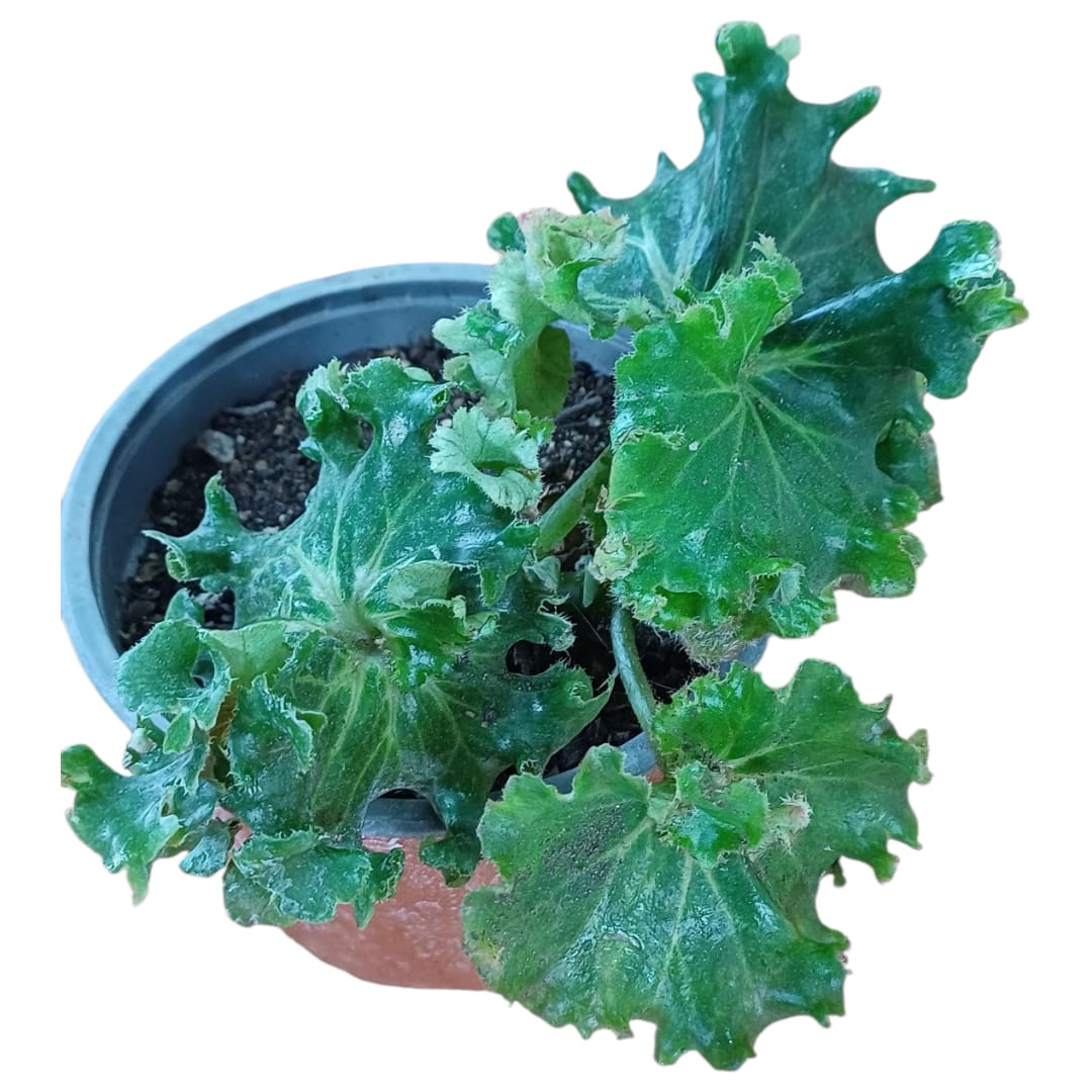 Lo más llamativo de la Begonia 'Crispa' es la profunda textura de sus hojas. Son de un color verde oscuro profundo y brillante, pero su superficie no es lisa. Los bordes de cada hoja se rizan y se pliegan de forma irregular, creando un patrón de relieves y sombras que cambia con la luz. El envés de las hojas a menudo tiene un tinte rojizo o morado, lo que añade otra capa de color. Aunque produce pequeñas flores blancas o rosadas, el verdadero espectáculo de esta begonia es su follaje. Su crecimiento es compacto y denso, lo que la hace ideal para macetas de escritorio o estanterías.