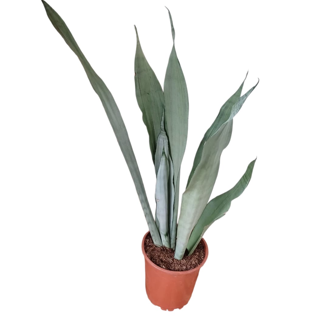 Lo más llamativo de la Sansevieria 'Moonshine' es, sin duda, su color único. Sus hojas, gruesas y en forma de espada, son de un tono plateado pálido que puede parecer casi blanco o un verde muy claro, especialmente en sus hojas más jóvenes. A medida que la planta madura, este color puede intensificarse, revelando sutiles bandas horizontales de un verde más oscuro. Este color claro la convierte en una pieza central impresionante en cualquier lugar, ya que contrasta maravillosamente con otros muebles y plantas de color verde intenso. Su crecimiento vertical y su porte elegante la hacen perfecta para añadir altura y textura a cualquier rincón de la casa.