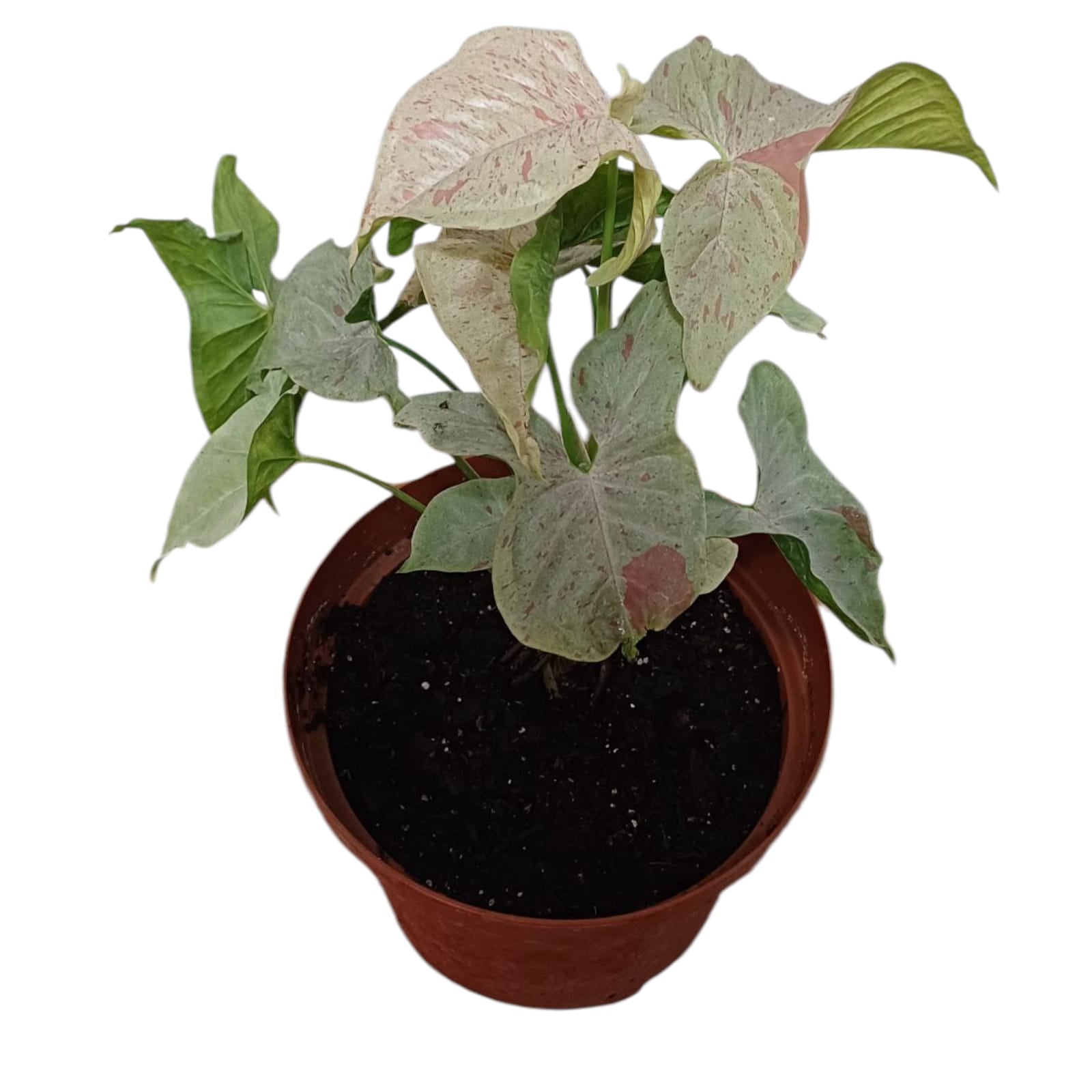 Disfruta de la elegante y atractiva Singonio Confeti XL con sus hojas en tonos verdes y pigmentos rosados. Esta planta es muy fácil de cuidar, lo que la hace perfecta para cualquier persona. Añade un toque de color y vida a cualquier espacio con esta hermosa planta de Singonio.